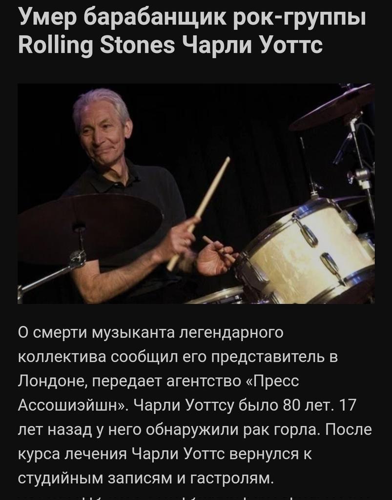 Уоттс выступал с «роллингами» почти 60 лет — с 1963 года. Charlie watts of the rolling stones has died at 80.